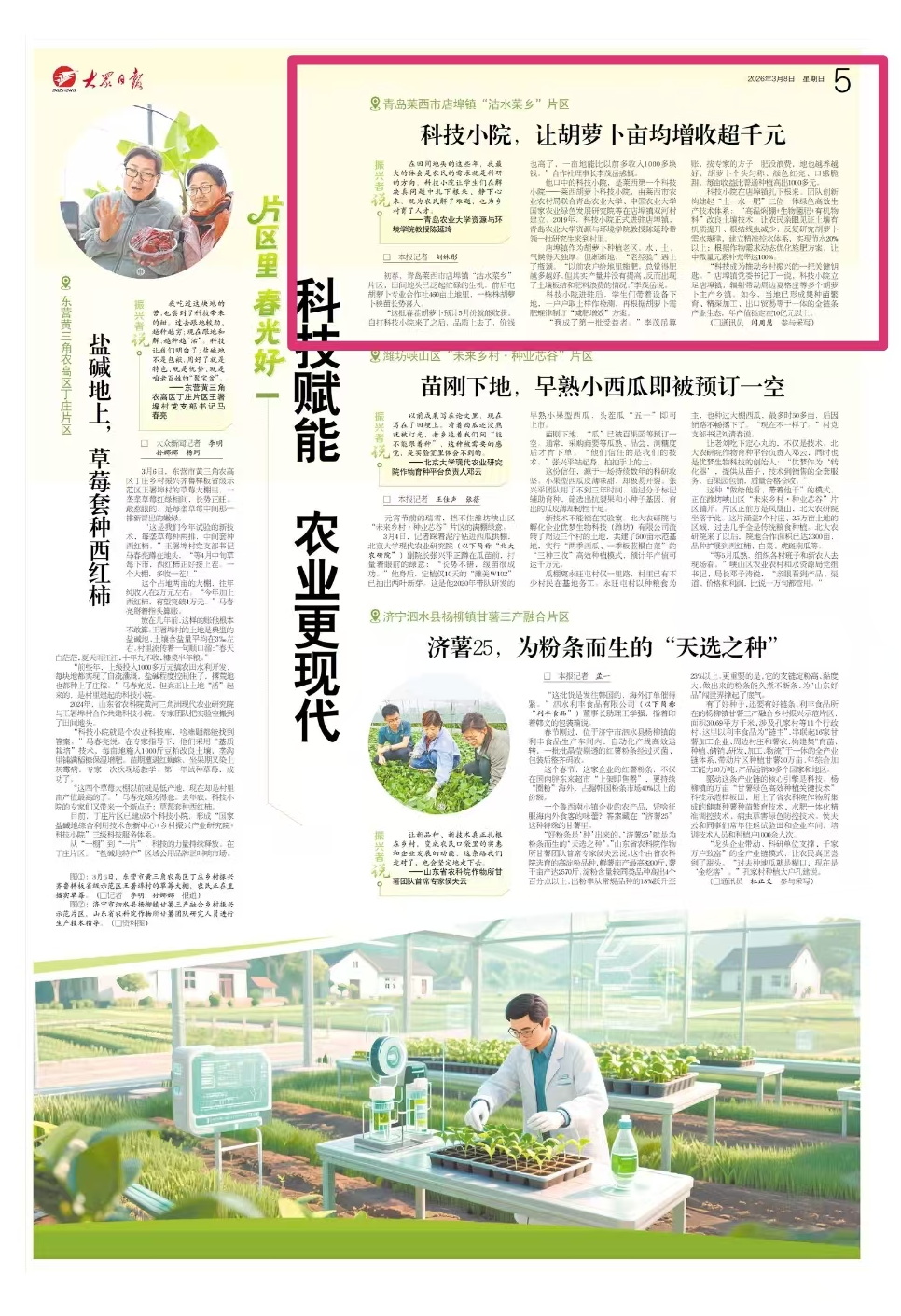 【编者按】3月8日,大众日报05版以“科技小院,让胡萝卜亩均增收超千元”为题,报道青岛农业大学莱西胡萝卜科技小院通过构建“土—水—肥”三位一体绿色高效生产技术体系助力当地胡萝卜生产。