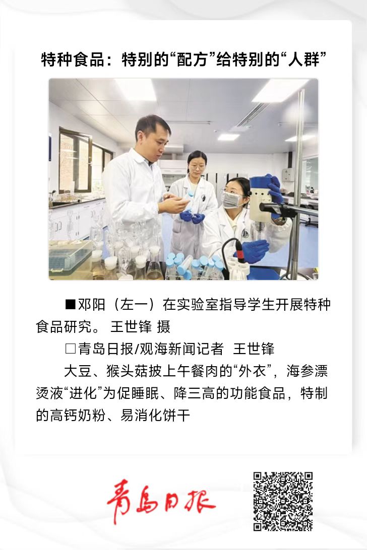 【编者按】1月6日,青岛日报以《特种食品:特别的“配方”给特别的“人群”》为题,报道了青岛农业大学特种食品研究院让寻常的食材蜕变成符合健康高效、食用便捷、成分透明、场景适配等多重需求的特种食品,赋能特种食品产业高质量发展。