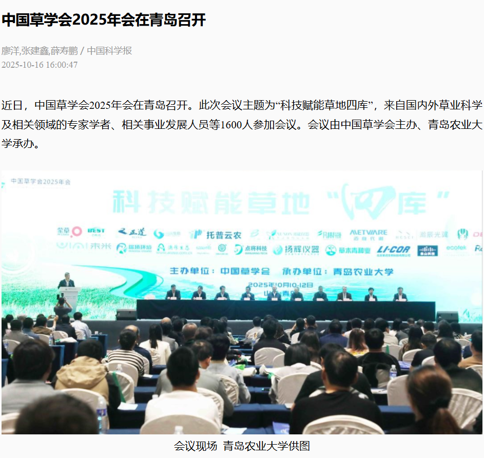 【编者按】10月11日,科技日报、中国科学报、大众日报、大众新闻、观海新闻、青岛电视台“今日”栏目和“青岛新闻”栏目、半岛新闻以《科技聚势,智启新程!中国草学会2025年会在青岛举行》为题报道了青岛农业大学承办中国草学会2025年会。