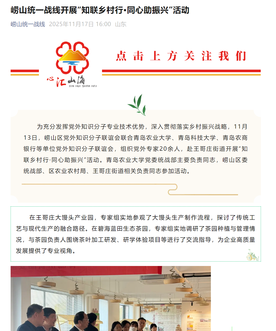 【编者按】11月17日,崂山统一战线以《崂山统一战线开展“知联乡村行·同心助振兴”活动》为题报道了青岛农业大学党委统战部主要负责同志赴王哥庄街道开展“知联乡村行·同心助振兴”活动。