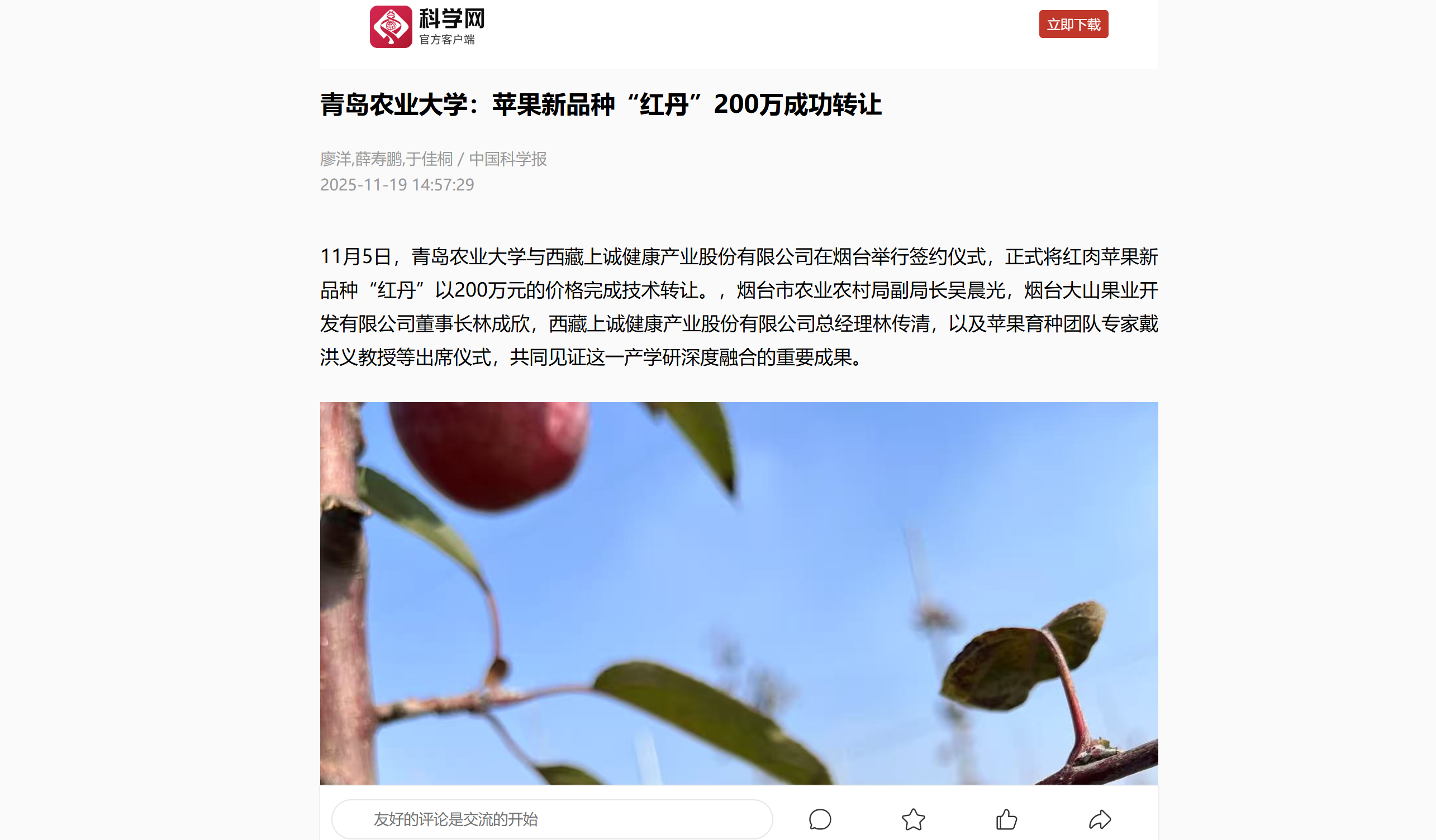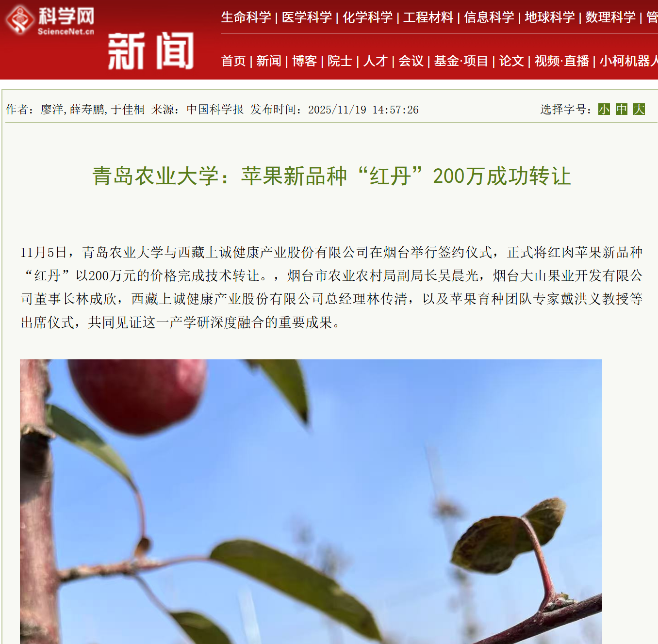 【编者按】11月19日,科学网、大众新闻以《青岛农业大学:苹果新品种“红丹”200万成功转让》为题,报道了青岛农业大学红肉苹果新品种“红丹”以200万元的价格完成技术转让。