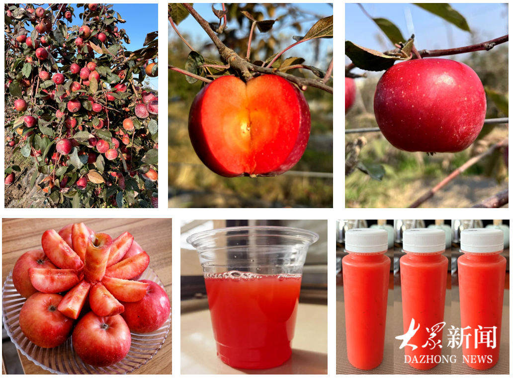 “红丹”果实近圆形,单果重132.1克,果面深红,果肉鲜红硬脆,甜酸适口且无涩味,可溶性固形物含量达15.5%,富含类黄酮与花青苷,兼具鲜食与加工价值,尤其适合NFC果汁和果酒生产。该品种10月下旬成熟,低温贮藏可达近一年,且早花早果、丰产性强,抗早期落叶病,栽培过程无需拉枝套袋,省力轻简。