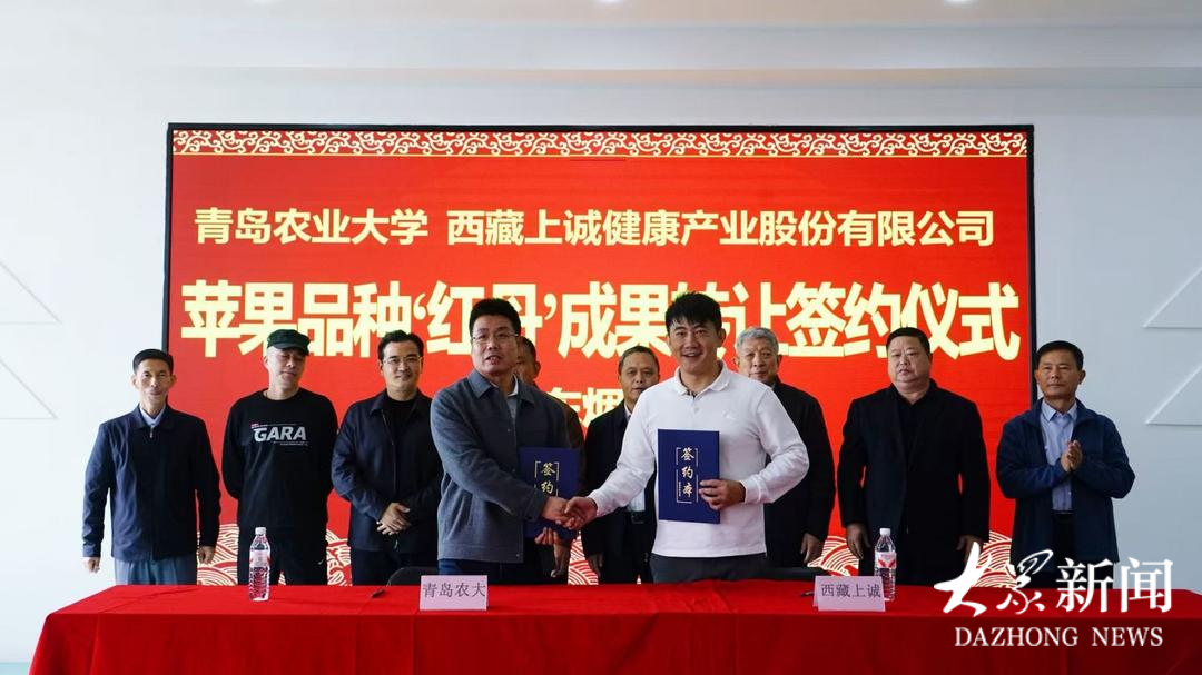 11月5日,青岛农业大学与西藏上诚健康产业股份有限公司在烟台举行签约仪式,正式将红肉苹果新品种“红丹”以200万元的价格完成技术转让。,烟台市农业农村局副局长吴晨光,烟台大山果业开发有限公司董事长林成欣,西藏上诚健康产业股份有限公司总经理林传清,以及苹果育种团队专家戴洪义教授等出席仪式,共同见证这一产学研深度融合的重要成果。