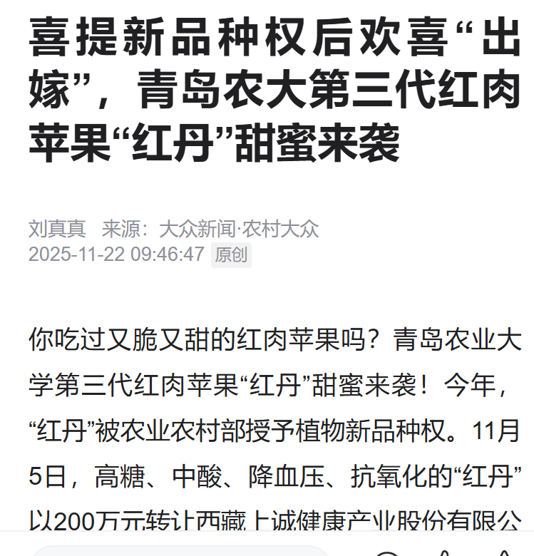 今年11月,青岛农业大学红肉苹果新品种“红丹”以200万元转让西藏上诚健康产业股份有限公司。