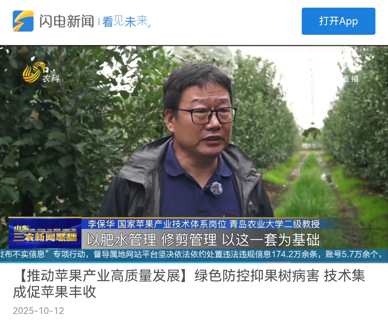 【编者按】10月12日,山东三农新闻联播以《【推动苹果产业高质量发展】绿色防控抑果树病害 技术集成促苹果丰收》为题报道青岛农业大学以生态为主监测预测相结合的精准用药促苹果丰收。