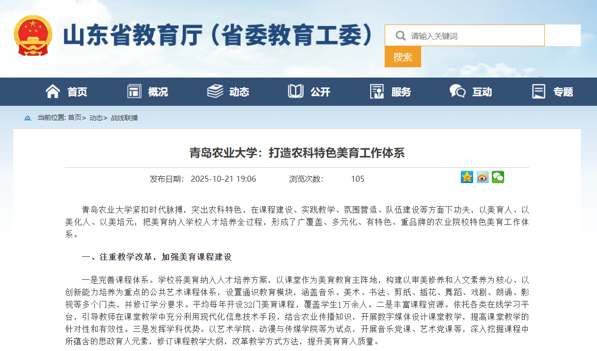 山东省教育厅网站“战线联播”栏目报道青岛农业大学建设农业院校特色美育工作体系的典型经验。
