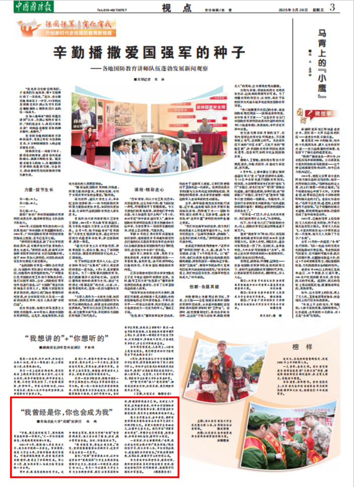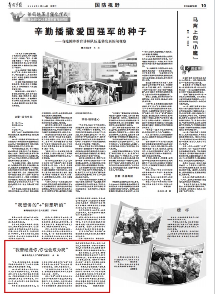 3月26日,《解放军报》《中国国防报》以《我曾经是你,你也会成为我》为题,聚焦报道我校“戎耀”退役大学生宣讲团殷鹏的蜕变成长的故事。