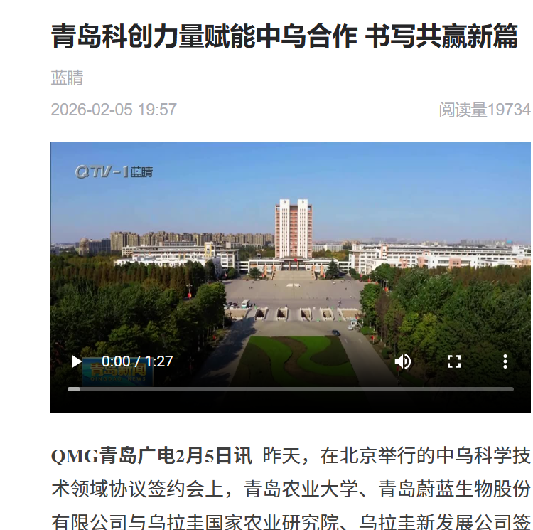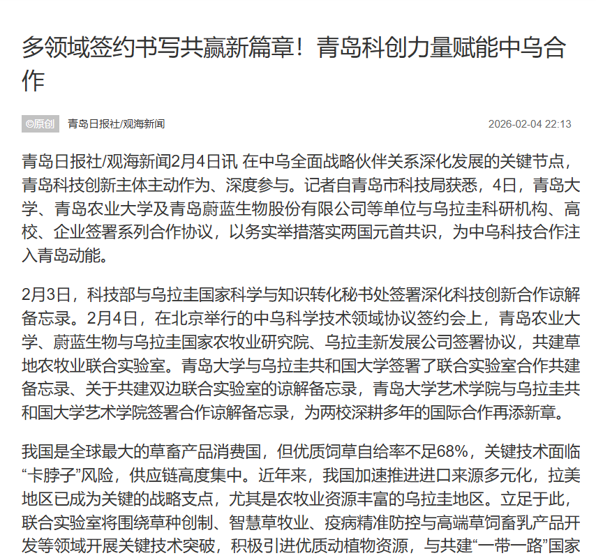 【编者按】2月5日,新华网、山东外事、青岛电视台、大众新闻、观海新闻以《青岛科创力量赋能中乌合作 书写共赢新篇》为题报道了青岛农业大学、青岛蔚蓝生物股份有限公司与乌拉圭国家农业研究院、乌拉圭新发展公司签署协议,共建草地农牧业联合实验室。