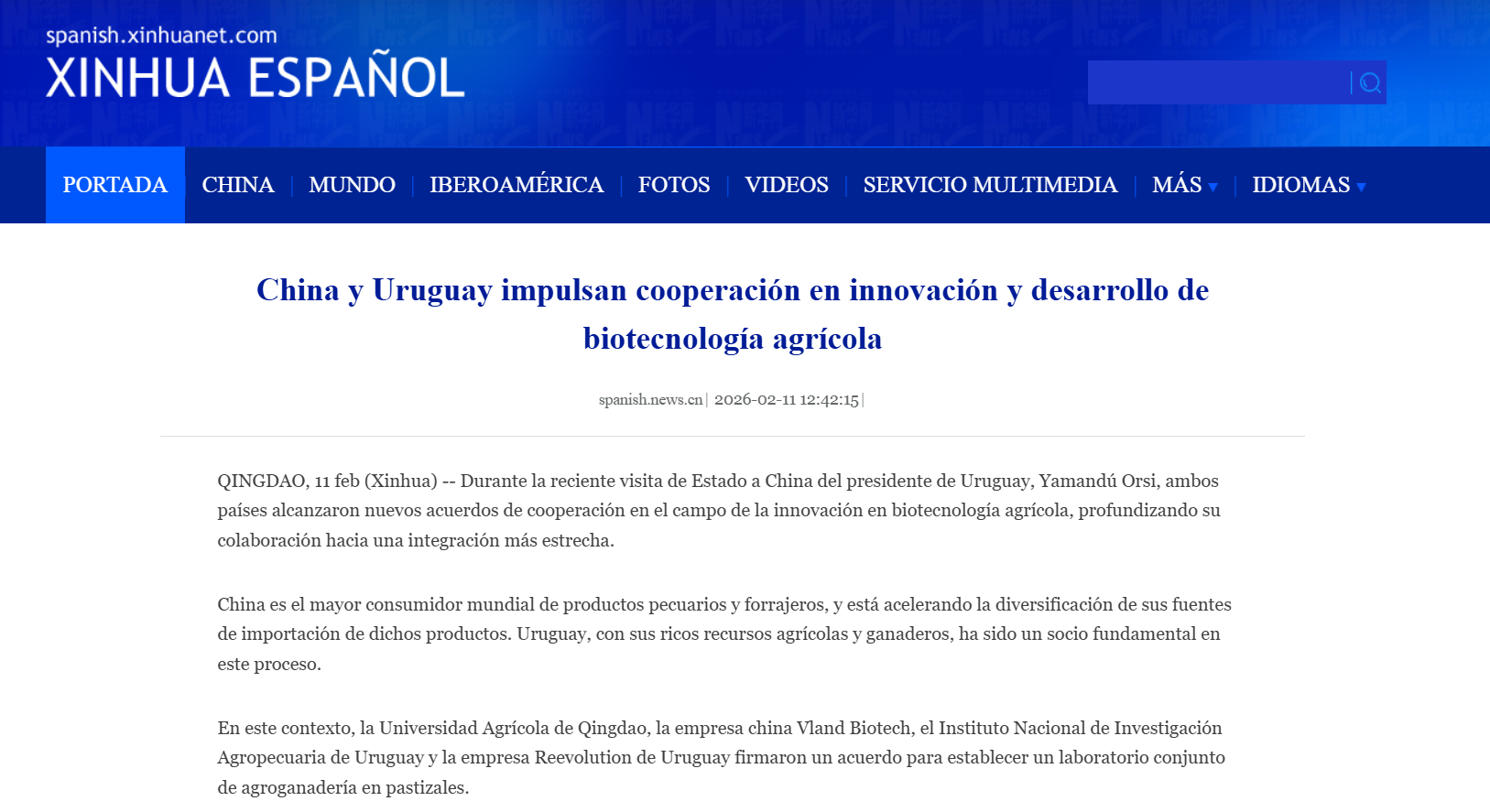QINGDAO, 11 feb (Xinhua) -- Durante la reciente visita de Estado a China del presidente de Uruguay, Yamandú Orsi, ambos países alcanzaron nuevos acuerdos de cooperación en el campo de la innovación en biotecnología agrícola, profundizando su colaboración hacia una integración más estrecha.