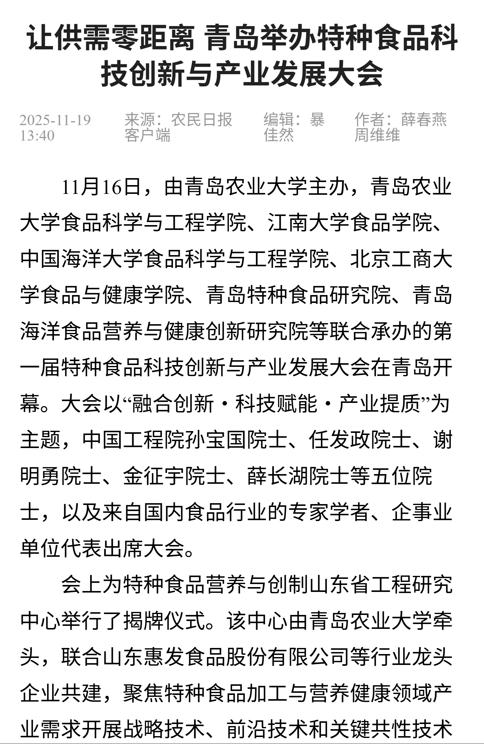 农民日报:让供需零距离 青岛举办特种食品科技创新与产业发展大会