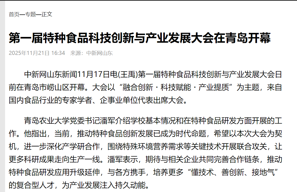 青岛日报“观海新闻”:第一届特种食品科技创新与产业发展大会在青举行