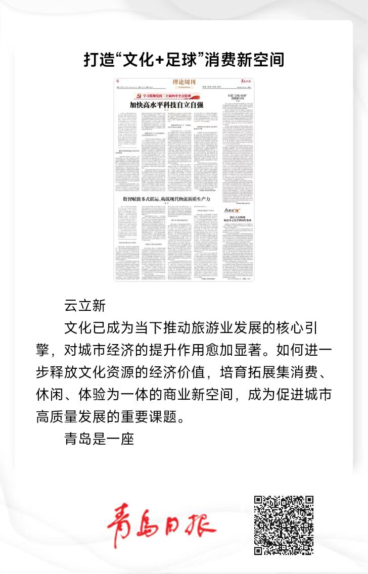 【编者按】12月2日,青岛日报刊发青岛农业大学人文社会科学学院云立新教授题为《打造“文化+足球”消费新空间》的文章,介绍青岛重构“足球文化”的消费逻辑,为全市文旅高质量发展注入新活力。