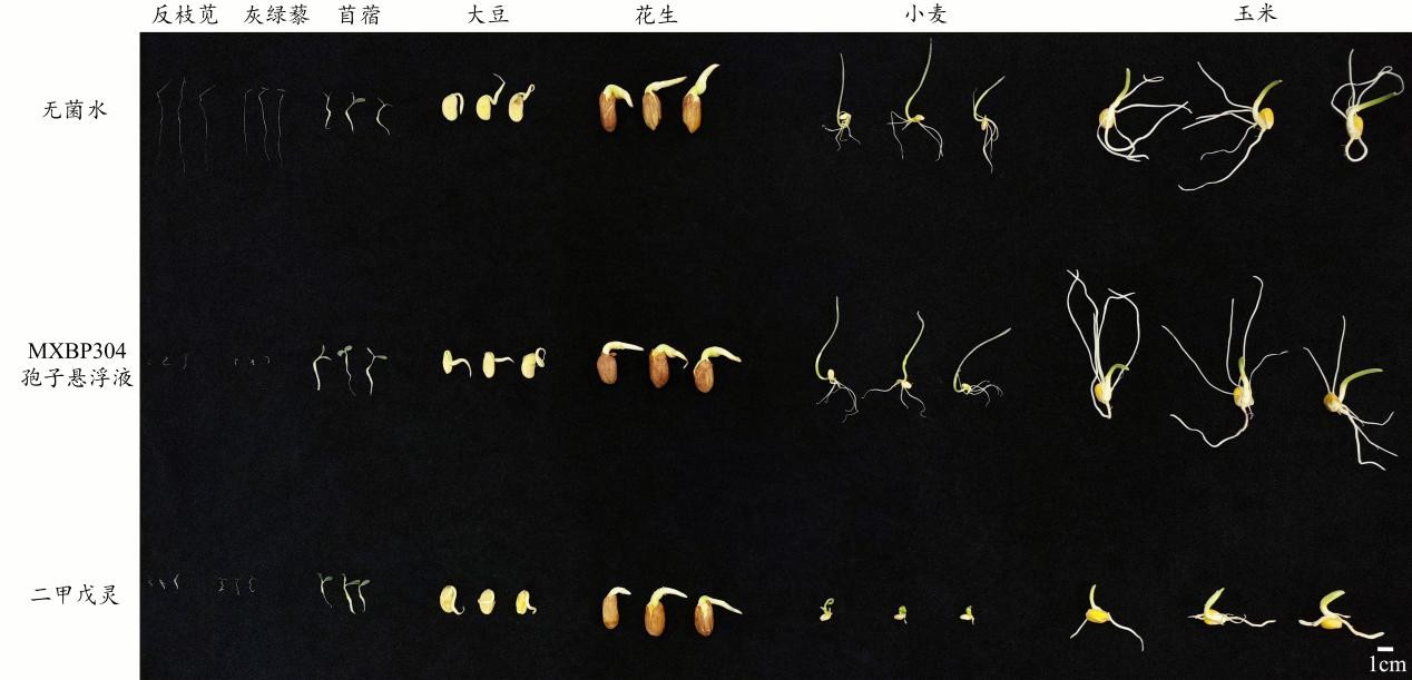 MXBP304孢子悬浮液和二甲戊灵对反枝苋、灰绿藜、苜蓿、大豆、花生、小麦和玉米种子萌发的影响对比。孙娟供图