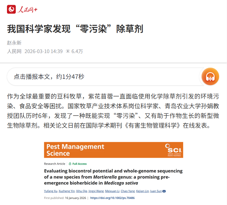 【编者按】3月10日,人民网以“我国科学家发现‘零污染’除草剂”为题报道国家牧草产业技术体系岗位科学家、青岛农业大学孙娟教授团队历时6年,发现了一种既能实现“零污染”、又有助于作物生长的新型微生物除草剂。