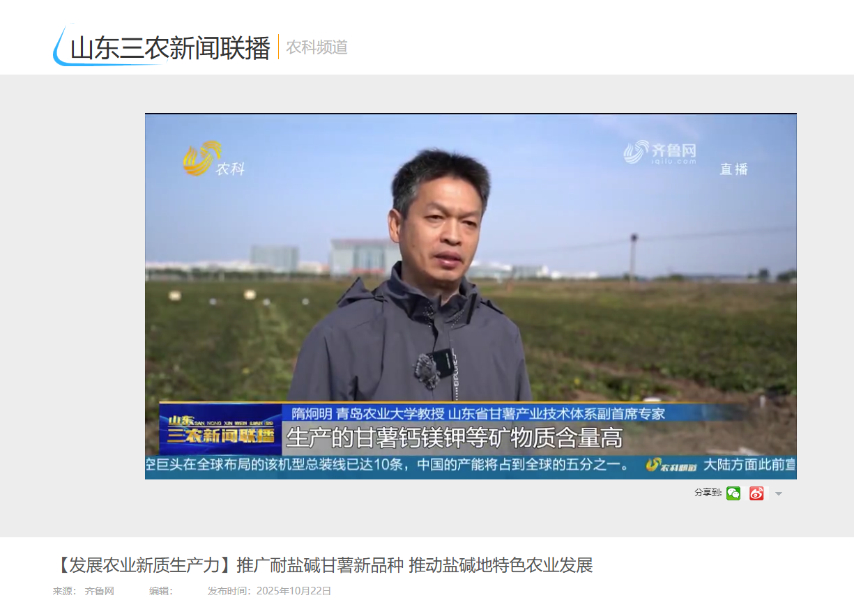 【编者按】10月22日,山东卫视“山东三农新闻联播”以《【发展农业新质生产力】推广耐盐碱甘薯新品种 推动盐碱地特色农业发展》为题报道青岛农业大学甘薯产业体系团队用科技力量推动盐碱地特色农业发展。