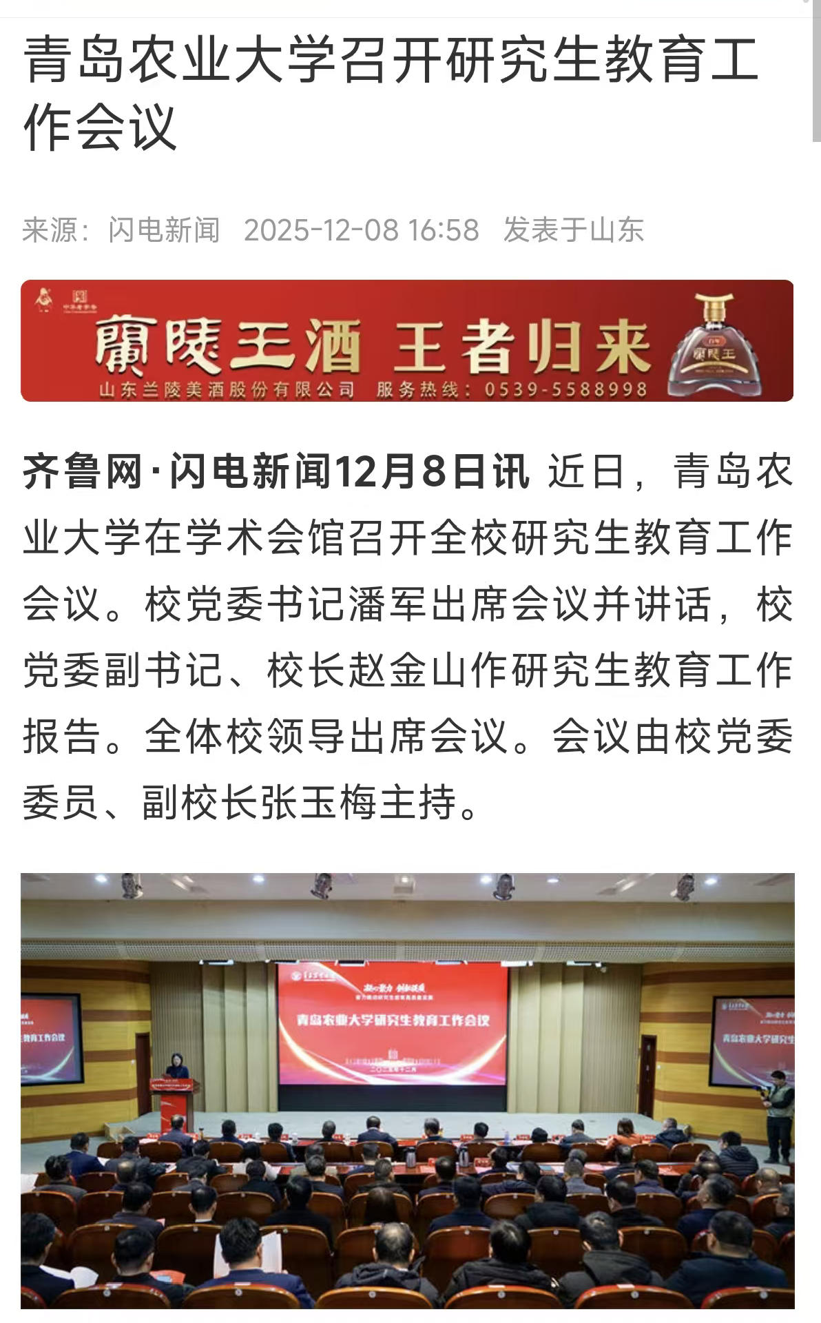 【编者按】12 月 8 日,闪电新闻、山东教育新闻以《青岛农业大学召开研究生教育工作会议》为题,报道青岛农业大学召开全校研究生教育工作会议,发布相关行动方案,表彰研究生教育先进集体与个人,推动研究生教育高质量发展。