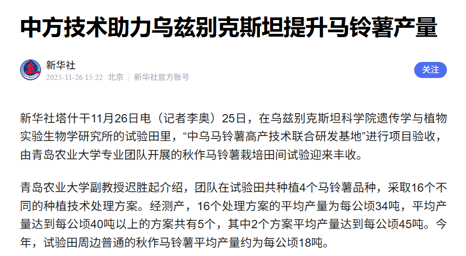 11月26日,新华社报道了我校与乌兹别克斯坦科学院遗传学与植物实验生物学研究所联合开展的秋作马铃薯栽培田间试验获得丰收,新华网、人民网国际栏目分别进行转发。