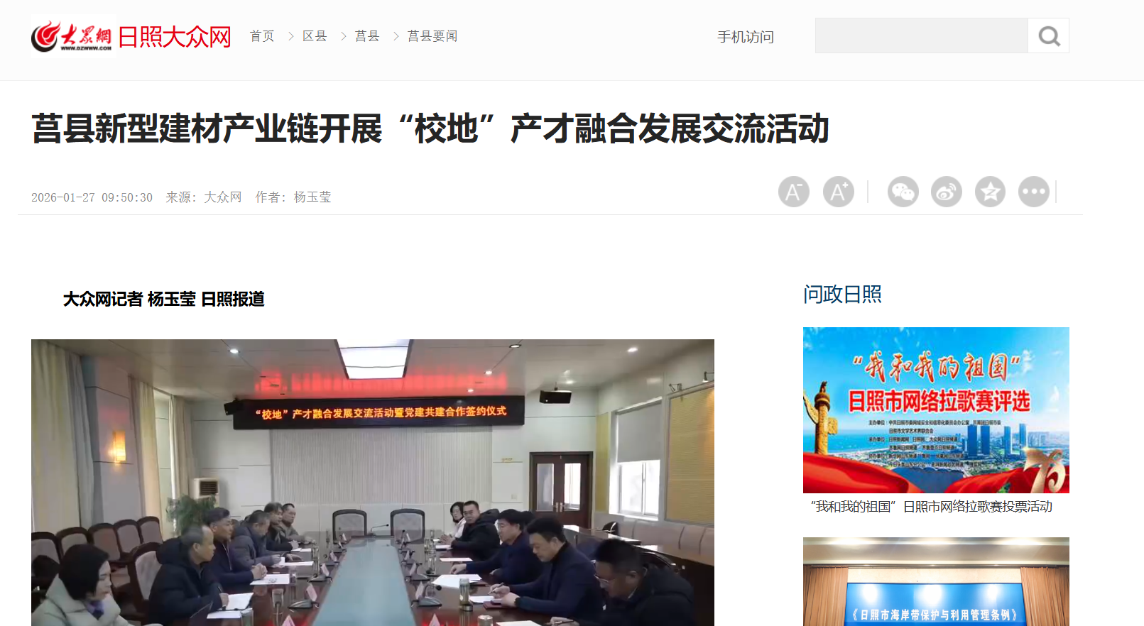 【编者按】1月30日,大众网、海报新闻、爱莒县报道了青岛农业大学建筑工程学院与莒县开展“校地”产才融合发展对接交流活动暨党建共建合作签约仪式,有效推进高质量助推企业与高校、科研院所产才融合发展,共同谱写校地合作、互利共赢的新篇章。