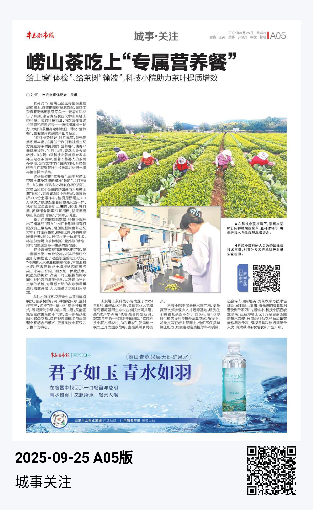 【编者按】9月24日,半岛都市报以《崂山秋茶采摘正当时!科技小院“营养餐”助力茶叶提质增效》为题,报道了青岛农业大学山东崂山科技小院以科技之力,大幅提升了崂山秋茶的产量和品质。