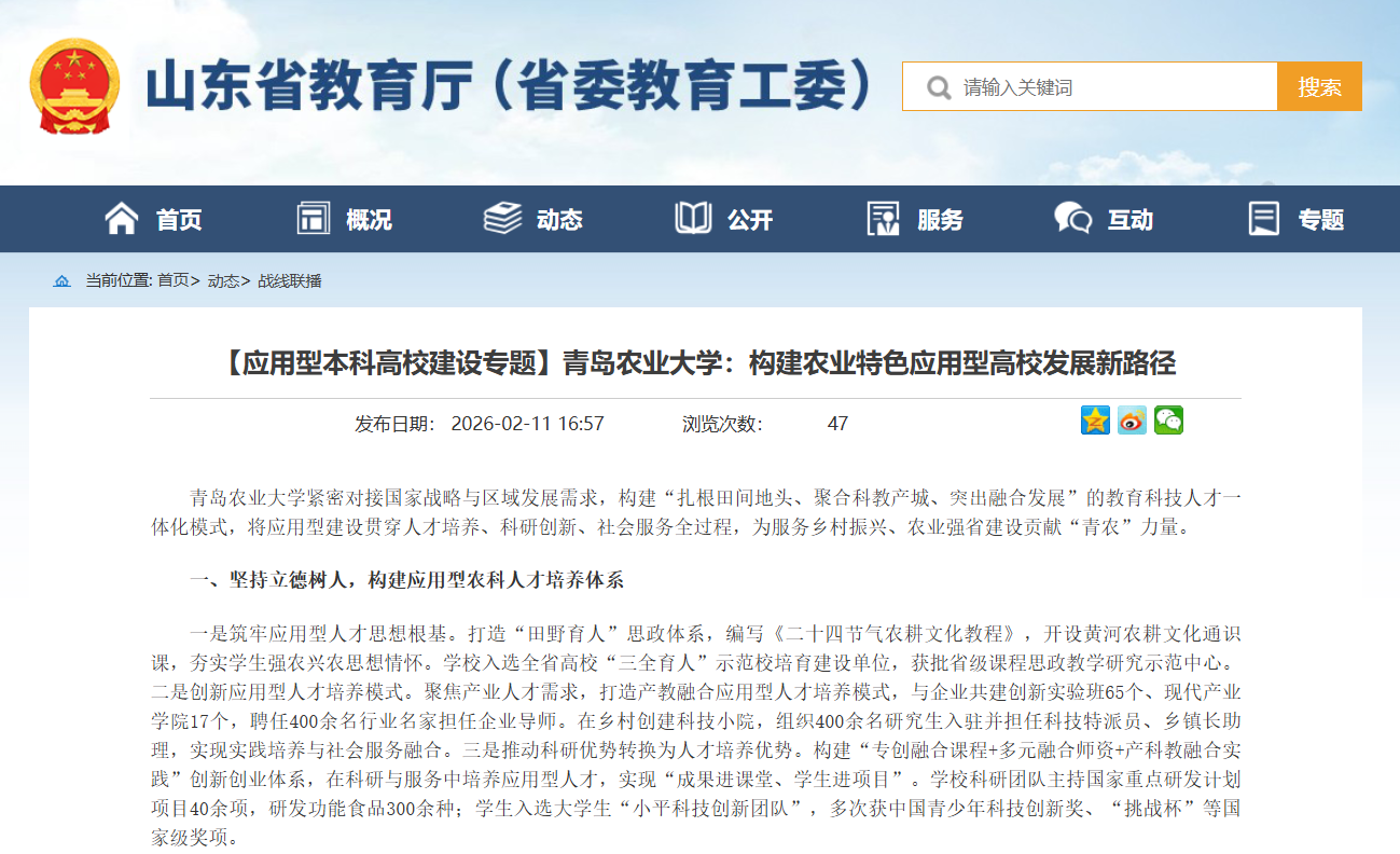 【编者按】2月11日,山东省教育厅网站《战线联播》栏目【应用型本科高校建设专题】以《青岛农业大学:构建农业特色应用型高校发展新路径》为题,报道我校紧密对接国家战略与区域发展需求,构建“扎根田间地头、聚合科教产城、突出融合发展”的教育科技人才一体化模式,将应用型建设贯穿人才培养、科研创新、社会服务全过程,为服务乡村振兴、农业强省建设贡献“青农”力量。