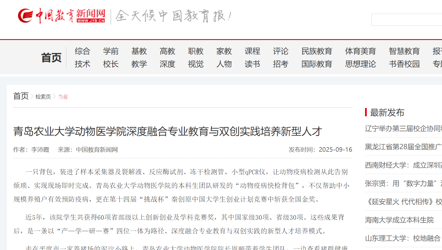 【编者按】9月16日,中国教育新闻网以《青岛农业大学动物医学院深度融合专业教育与双创实践培养新型人才》为题,报道青岛农业大学动物医学院将专业教育与双创实践融合,培养兽医双创人才。