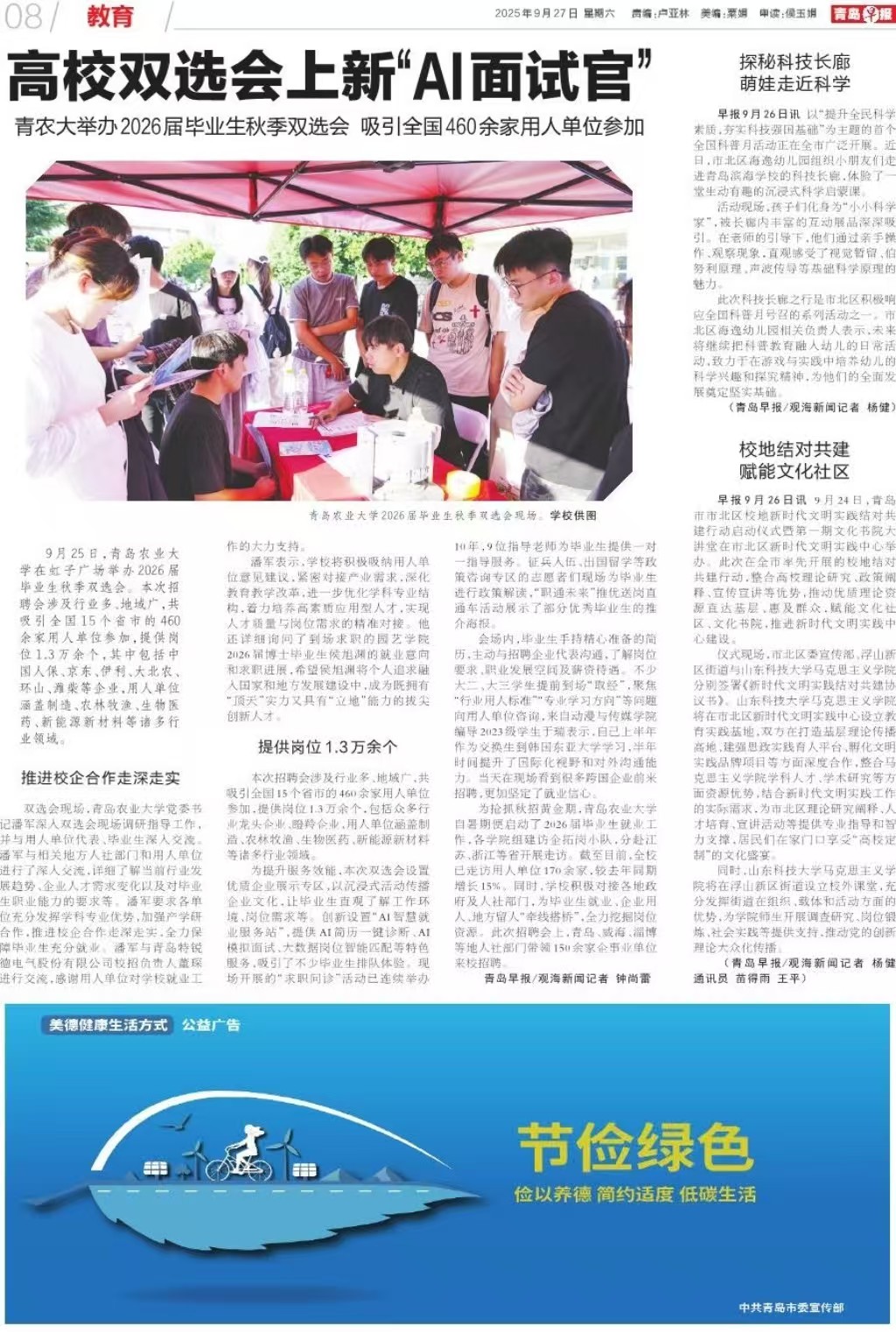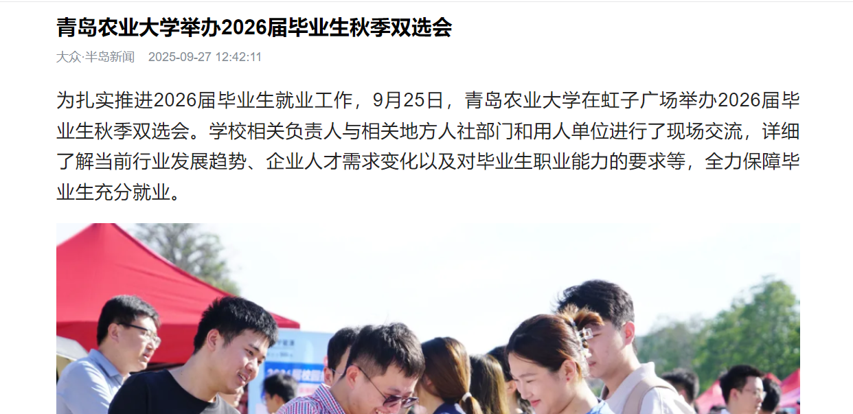 【编者按】9月27日,山东教育卫视、青岛早报、半岛新闻报道了青岛农业大学举办2026届毕业生秋季双选会, 吸引全国460余家用人单位参加。