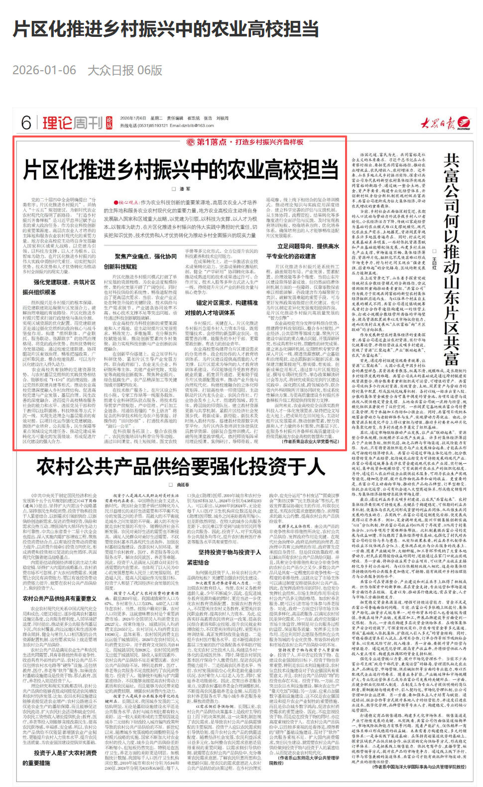 【编者按】近年来,青岛农业大学锚定乡村振兴国家战略,全力推进服务山东乡村振兴片区建设。以党建链为引领,有机串联人才链、科技链、产业链,将雄厚的科研学术优势转化为乡村振兴内生动力;依托乡村振兴特色智库,深耕决策咨询领域,持续提升智力支撑“软实力”;组建专家顾问团,下沉片区一线,精准对接需求,为乡村产业发展激活强劲“新动能”,在深化校地融合实践中彰显了服务国家重大战略的使命自觉与创新实践。1 月 6 日,《大众日报》理论版头条以《片区化推进乡村振兴中的农业高校担当》为题,刊发我校党委书记潘军同志署名文章,系统阐述地方农业高校在片区化推进乡村振兴中的责任担当。