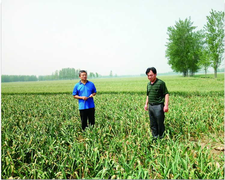 第一书记丛鹏(左)与农民在田间交流。